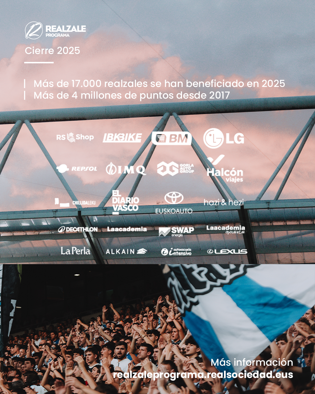 Realzale Programa se acerca a un nuevo cierre de año, habiendo beneficiado durante 2025 a más de 17.000 realzales, los cuales han acumulado puntos con su consumo diario en las veinte marcas asociadas. Desde que se lanzase en septiembre de 2017, la familia txuri urdin (socios, accionistas, RS Fan y RS Laguna) ha acumulado más de cuatro millones de puntos, lográndose unos descuentos importantes en las cuotas.