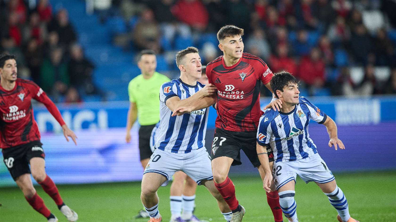 La primera parte ha mostrado un duelo equilibrado, con alternancia en el juego y aproximaciones para ambos equipos. La más clara para los txuri urdin ha llegado en un potente disparo de Balda desde la frontal tras un buen pase de Marchal que ha obligado a Nikic a intervenir. Las ocasiones han seguido, y Peru Rodríguez, en un remate de cabeza tras un córner, ha estado a punto de sorprender. El Mirandés ha respondido con una llegada de Álex Cardero que Fraga ha blocado con seguridad. Con pocas diferencias entre ambos, se ha llegado al descanso sin goles.