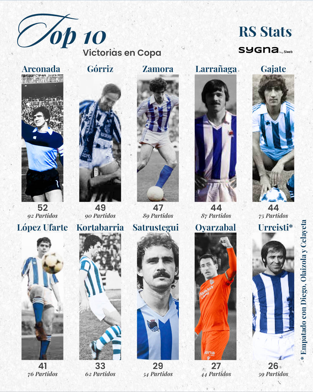 El capitán sigue agrandando su leyenda. La magnífica trayectoria que está protagonizando la Real en la Copa del Rey en los últimos años ha catapultado a Mikel Oyarzabal al top ten de realistas con más triunfos en el torneo del k.o, con 27 victorias. Basta con comprobar quiénes le acompañan en esta lista para darse cuenta de sus espectaculares registros.