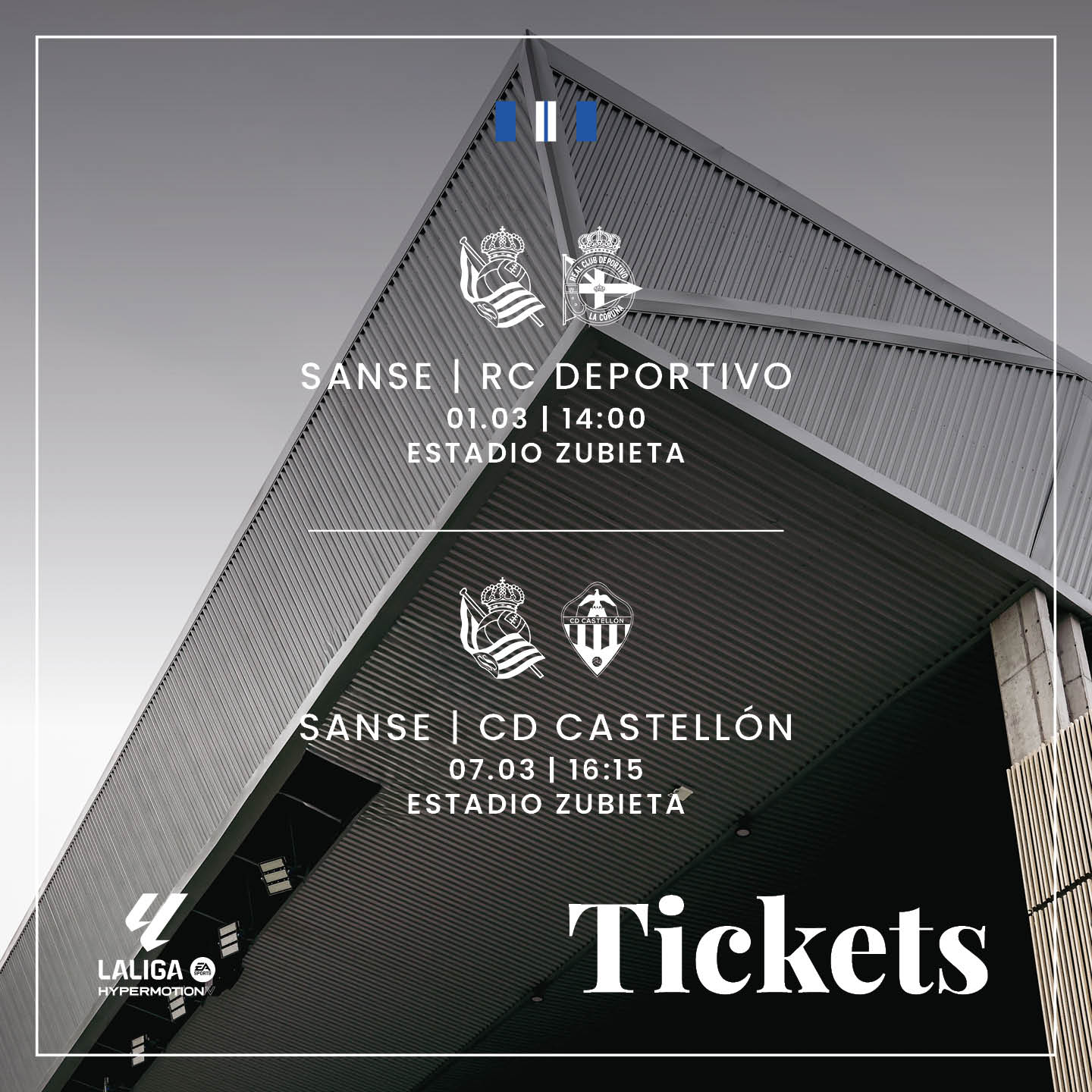 Ya están disponibles las localidades para los dos próximos encuentros que el Sanse disputará como local. Después de la cita de Cádiz, nuestro filial recibirá en el Estadio de Zubieta al RC Deportivo (1 de marzo, 14:00) y al CD Castellón (7 de marzo, 16:15).