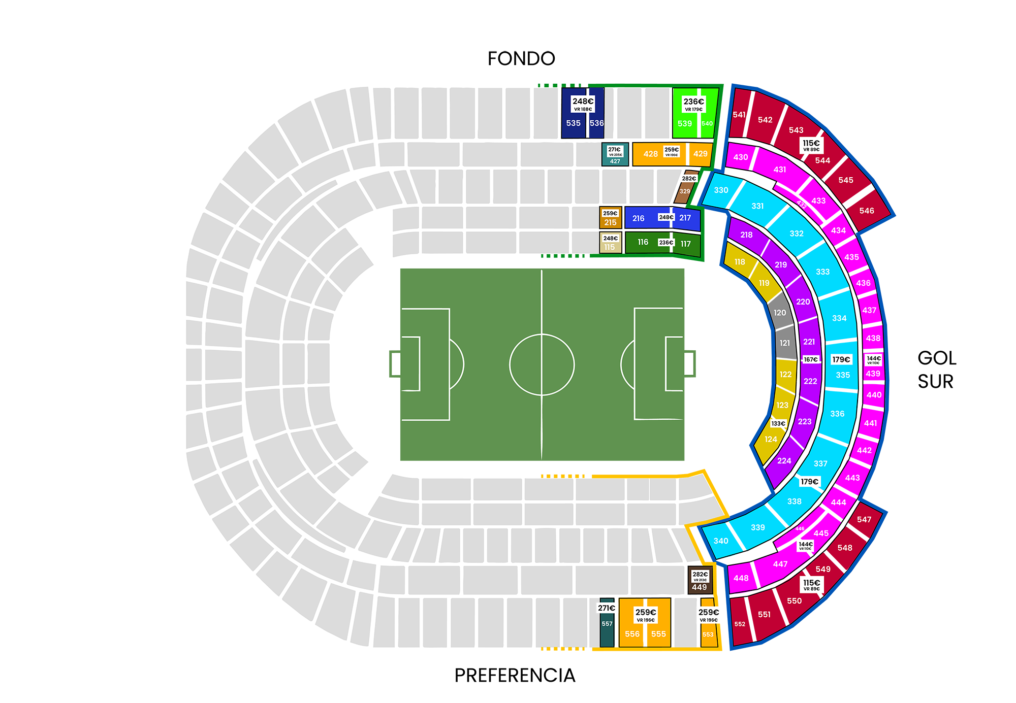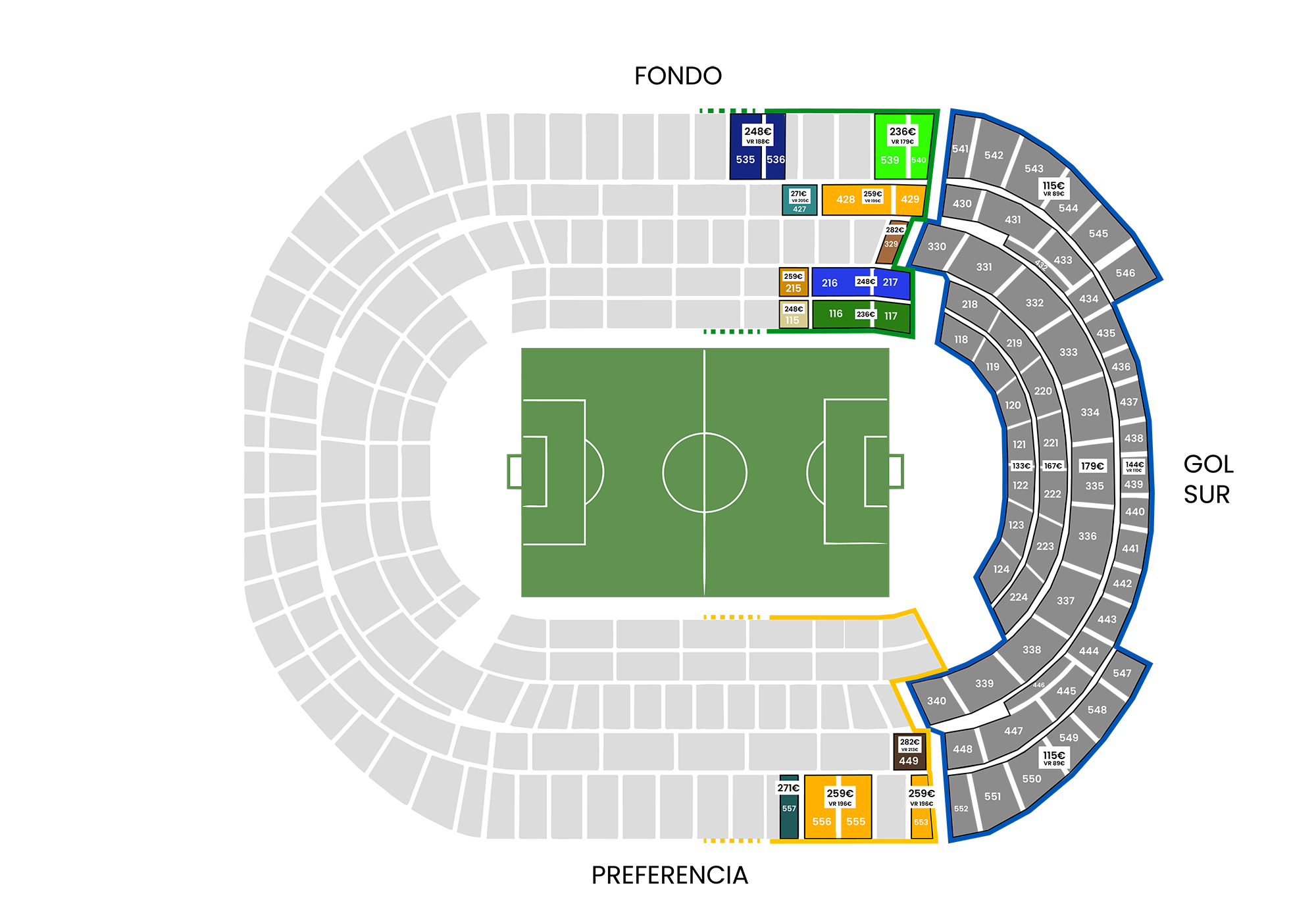 Hauek dira 6.1 atal honetan aipatzen diren lehentasun tribunako eta hondoko sektoreak: 449, 557, 556, 555, 553, 535, 539, 540, 427, 428, 429, 329, 215, 216, 217, 115, 116 eta 117.