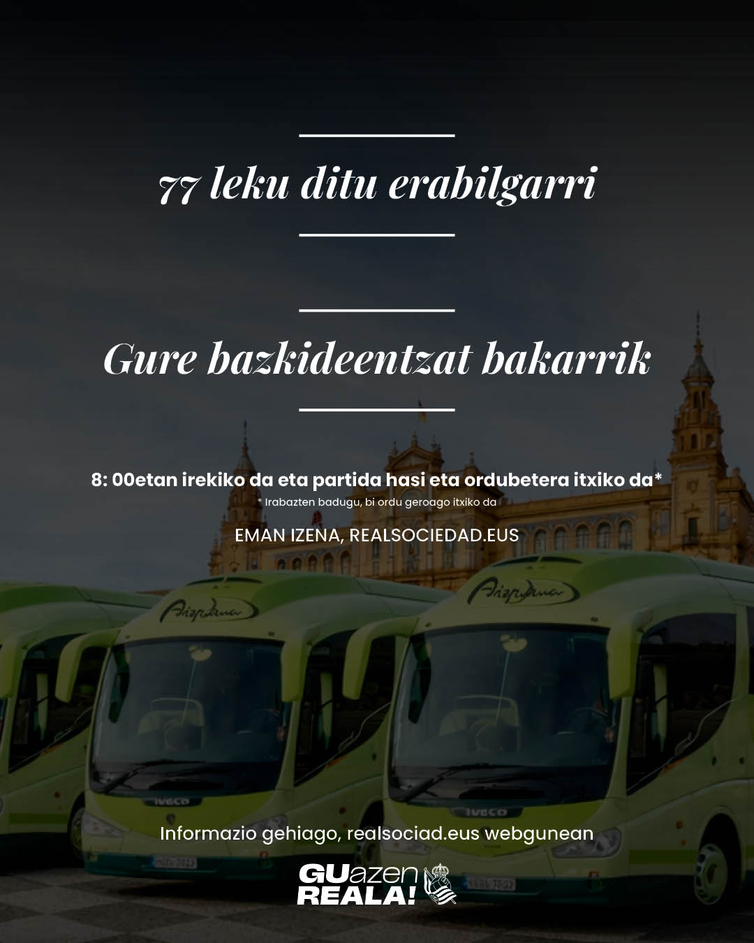 Autobusentzako aparkalekua antolatu da gure Fan Zonetik minutu gutxira. Aparkaleku hau gure bazkideak Sevillara eramaten dituzten autobusentzat bakarrik izango da. Gaurtik aurrera autobusentzako lekua erreserbatu daiteke aparkalekuan. Sevillara autobusez joaten den kolektibo bateko kide bazara, klikatu estekan plaza eskuratzeko. Aparkalekuak 77 plaza ditu. Gaitutako formularioaren bidez erregistratutako lehen 77 eskaerak aparkalekuan aparkatzeko eskubidea dutenak izango dira.