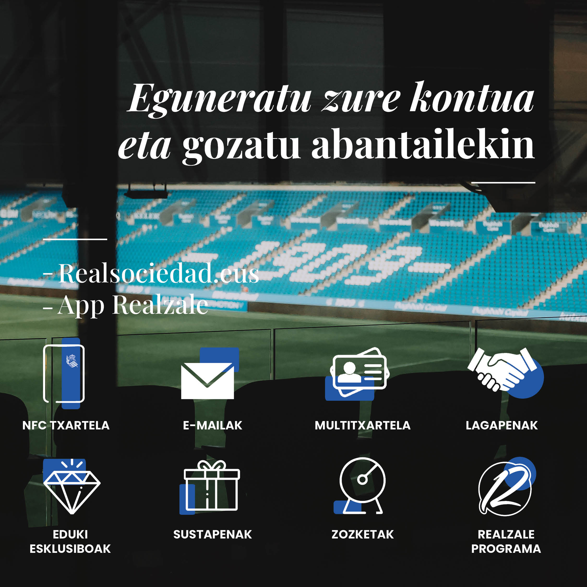 Izena emanez eta zure Realeko kontua eguneratuz ez duzu soilik txartel digitaleko berrikuntzez gozatzeko aukera izango. Bazkide bazara edo ez bazara, izena ematea edo Realeko kontua eguneratzea iradokitzen dizugu, beste abantaila batzuez baliatzeko, hala nola eduki esklusiboa, promozio digitalak edo fisikoak eskuratzeko, zozketetan parte hartzeko...